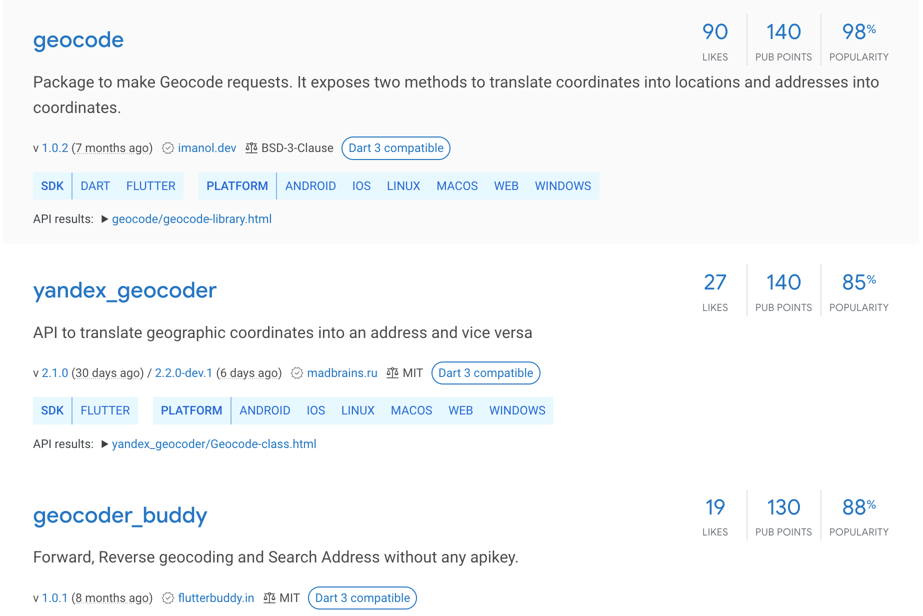 The very first result is geocode. At first sight it seems ok. It has 90 likes, 98% popularity, the last update is rather recent (7 months ago) and it is Dart 3 compatible. The API looks usable too.