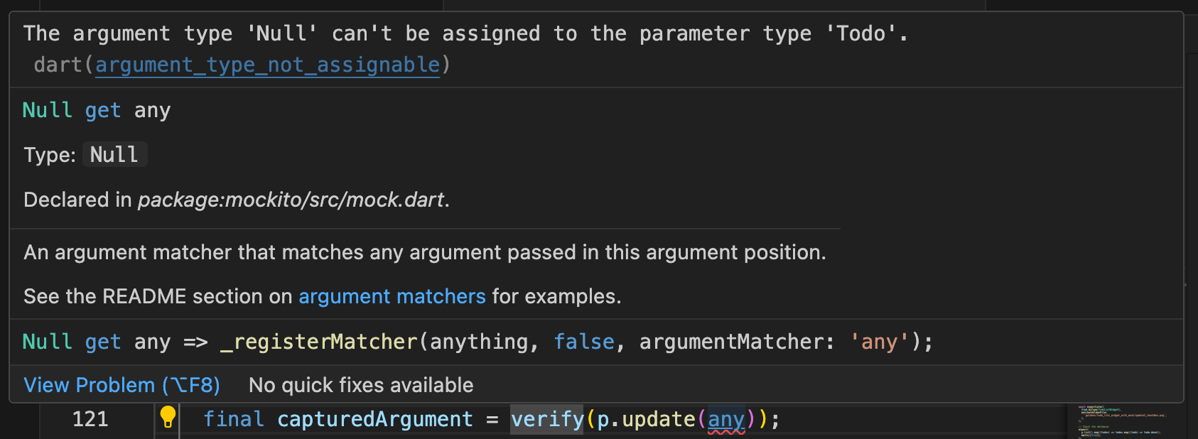 This morning I was trying to verify an invocation with Mockito in Dart, but somehow it threw an error about Null.