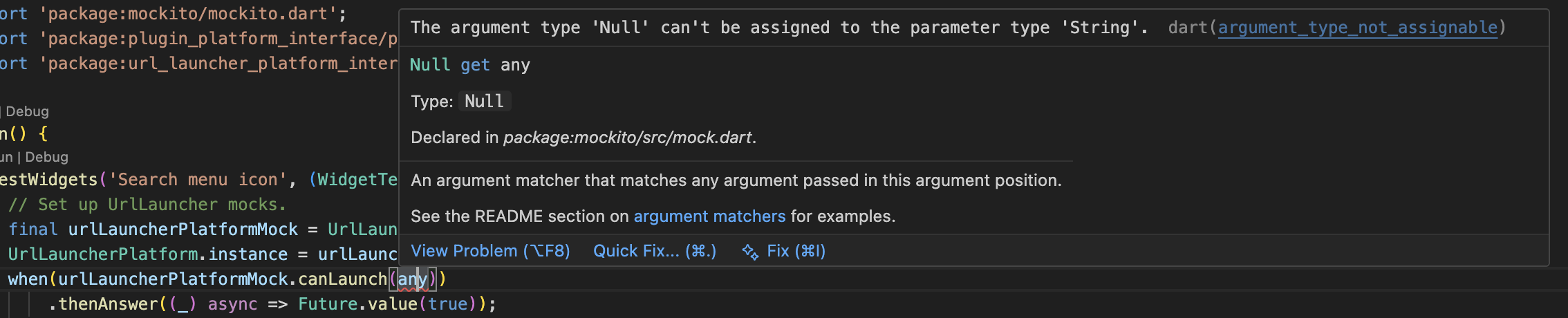This is because Mockito requires the method to accept nullable parameters for any to work. The problem is, the only way to generate methods that accept nullable parameters is to use Mockito's GenerateNiceMocks automated mock generation feature (https://pub.dev/packages/mockito#lets-create-mocks, https://github.com/dart-lang/mockito/blob/master/NULL_SAFETY_README.md).